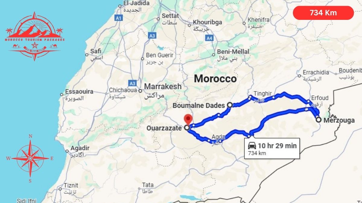 The journey from Ouarzazate to Merzouga is approximately 370 km (230 miles) and takes around 7–8 hours, but this our 4 days tour includes a night in Boumalne dades so we don’t drive the whole 370 km in one day.